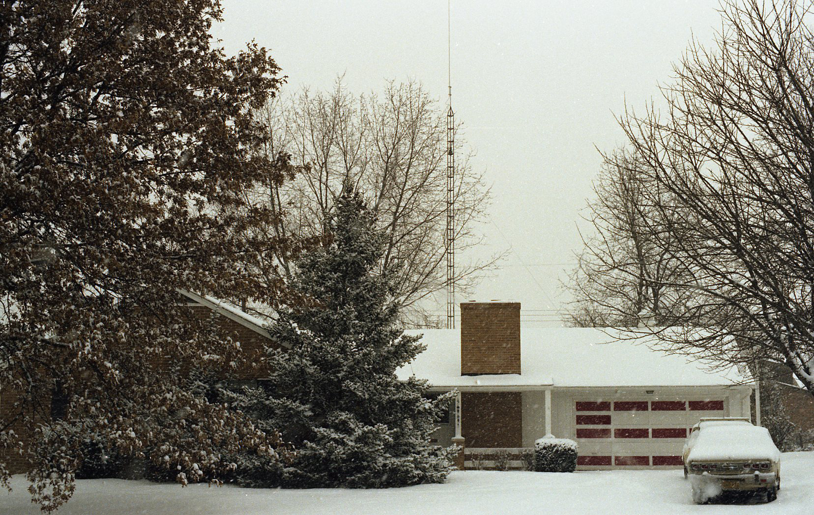"184 Crandall is where my parents [Albin B. and Maxine Shirk] lived in, I think, the 1970s and 1980s; after they moved from [525] Meadoway Park. The winter photo was taken in the 1970s. The pattern on the garage door is a large, red 'S.' The antenna tower behind the house was my father’s ham radio antenna."