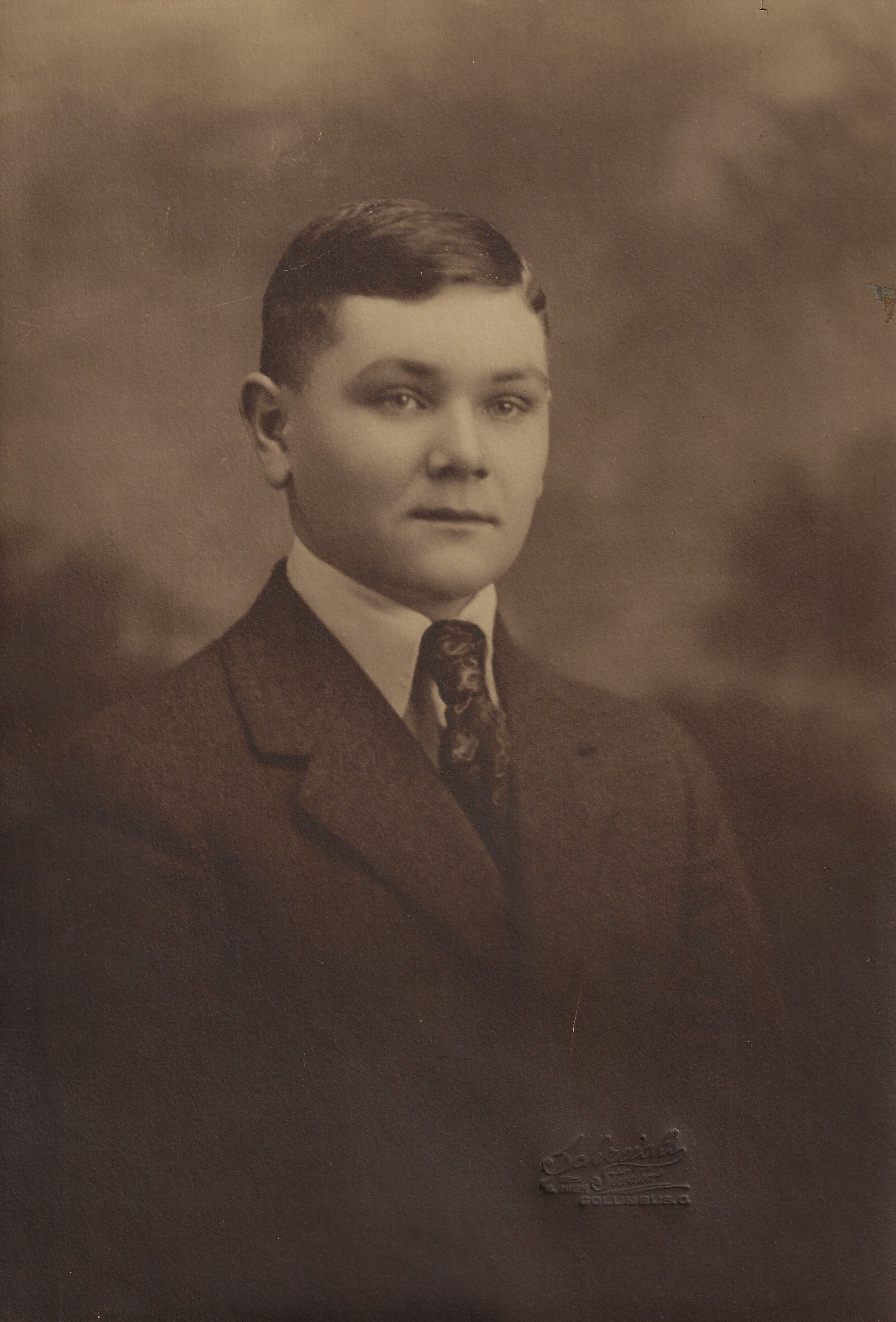 This photograph commemorates the graduation of Abner Eli Pinney (b. 1903, d. 1974) from Worthington High School in 1920. Pinney was the part of fourth generation of Pinney men in Worthington, descending from Scioto Company member Captain Abner Pinney (great-grandfather), Abner Henry Pinney (grandfather) and Nathan Pinney, Sr. (father). He married Letta Decker Pinney in 1933 and they raised their family in a home on West State Street. Pinney was Vice President and Resident Manager of the Rutherford-Corbin Funeral Home and was involved in many civic activities, including several Masonic organizations and was a Trustee of Walnut Grove Cemetery.