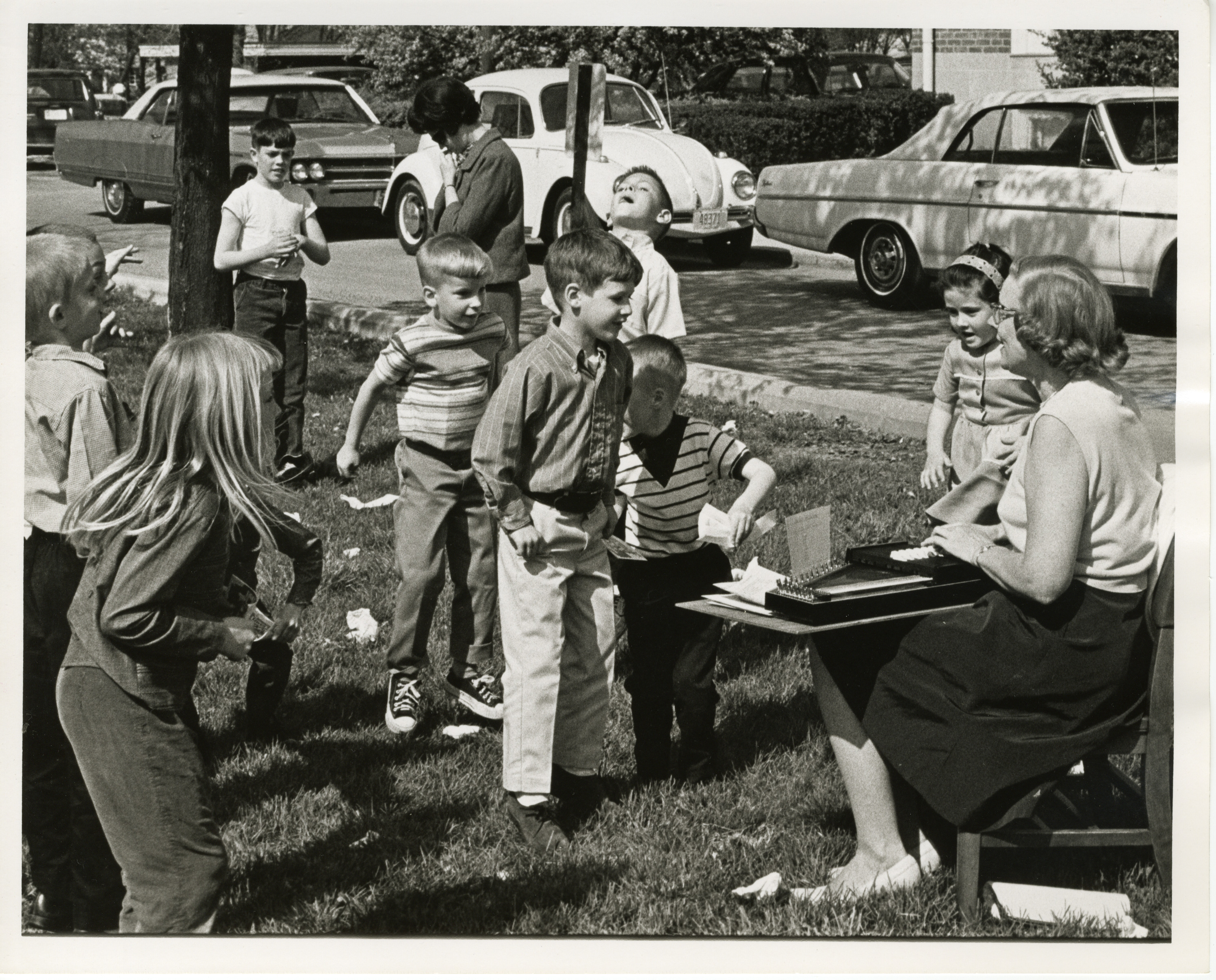 Shown in this black-and-white photograph is a group of children and an adult outside on the lawn at the Worthington Public Library’s National Library Week open house, held on April 28, 1968 at the Library’s then-location at 752 High Street. The adult is seated and playing an autoharp, and the children are standing around her. Parked cars are visible in the background.