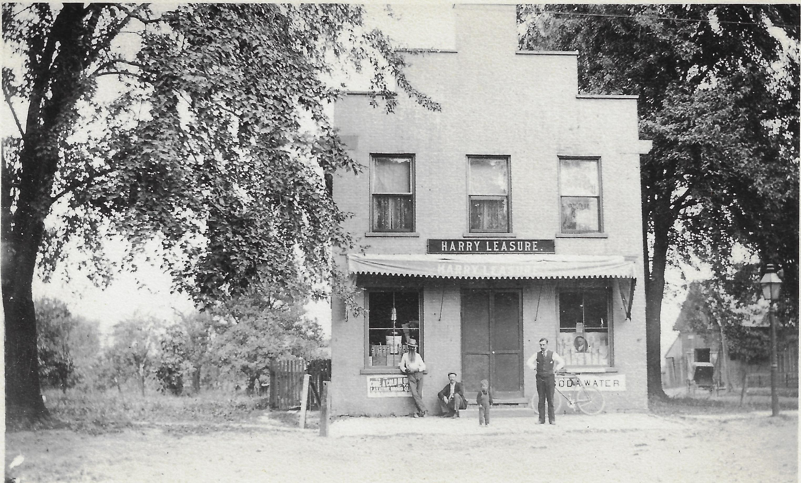 This photographic postcard depicts the Harry Leasure Drugstore with three men, a child, and a bicycle. This structure is located on the southwest corner of High Street and New England Avenue where Fritzy Jacobs is now located. Harry Leasure came to Worthington in 1894 and operated a drug store at this location until about 1908. The drugstore was downstairs and the Leasure family lived upstairs, paying $10 a month in rent. It was noted that Leasure got rent for half price the month his son Lawrence was born in 1896. He eventually moved his drugstore to a number of other locations including on the east side of High Street near the Village Green, the Jones Building on the west side of High and last a storefront in the middle of the block on the west side of High. Note that in this image High Street is a dirt road still, and the right side of the image shows a buggy, barn, and lamp post.