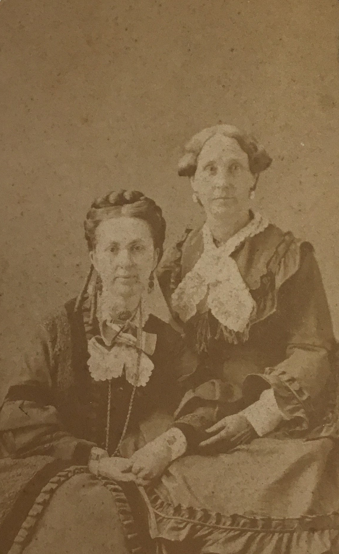 This photograph of cousins Helen Maynard Metcalf (left) and Mary Johnson Sessions (right) was taken in 1871 and comes from an album that belonged to Mrs. Metcalf.