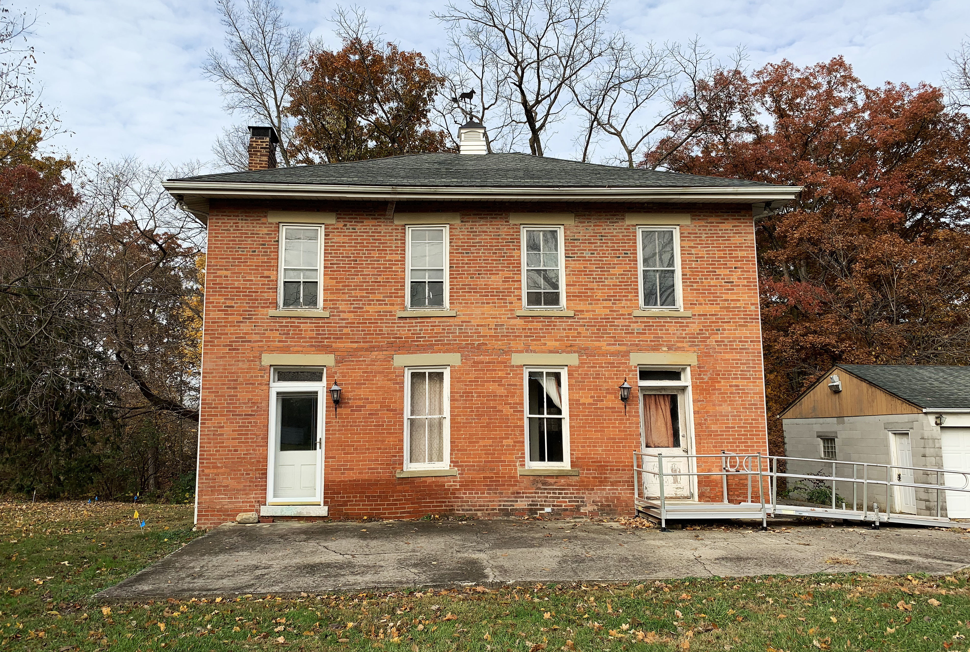 Small blue and yellow flags are visible in the ground to the left (west) of the house in this photo. At the time the photo was taken, researchers from The Ohio State University were using ground-penetrating radar in this area in an effort to find the answer to a decades-old legend. Behind the house is a brick shelter built into the ravine as it leads down to the creek; it was long believed that a tunnel ran from the shelter to the basement of the house, allowing enslaved people seeking their freedom to come into the house at night, when it was safe to do so. Researchers were unable to find evidence of the existence of this tunnel.