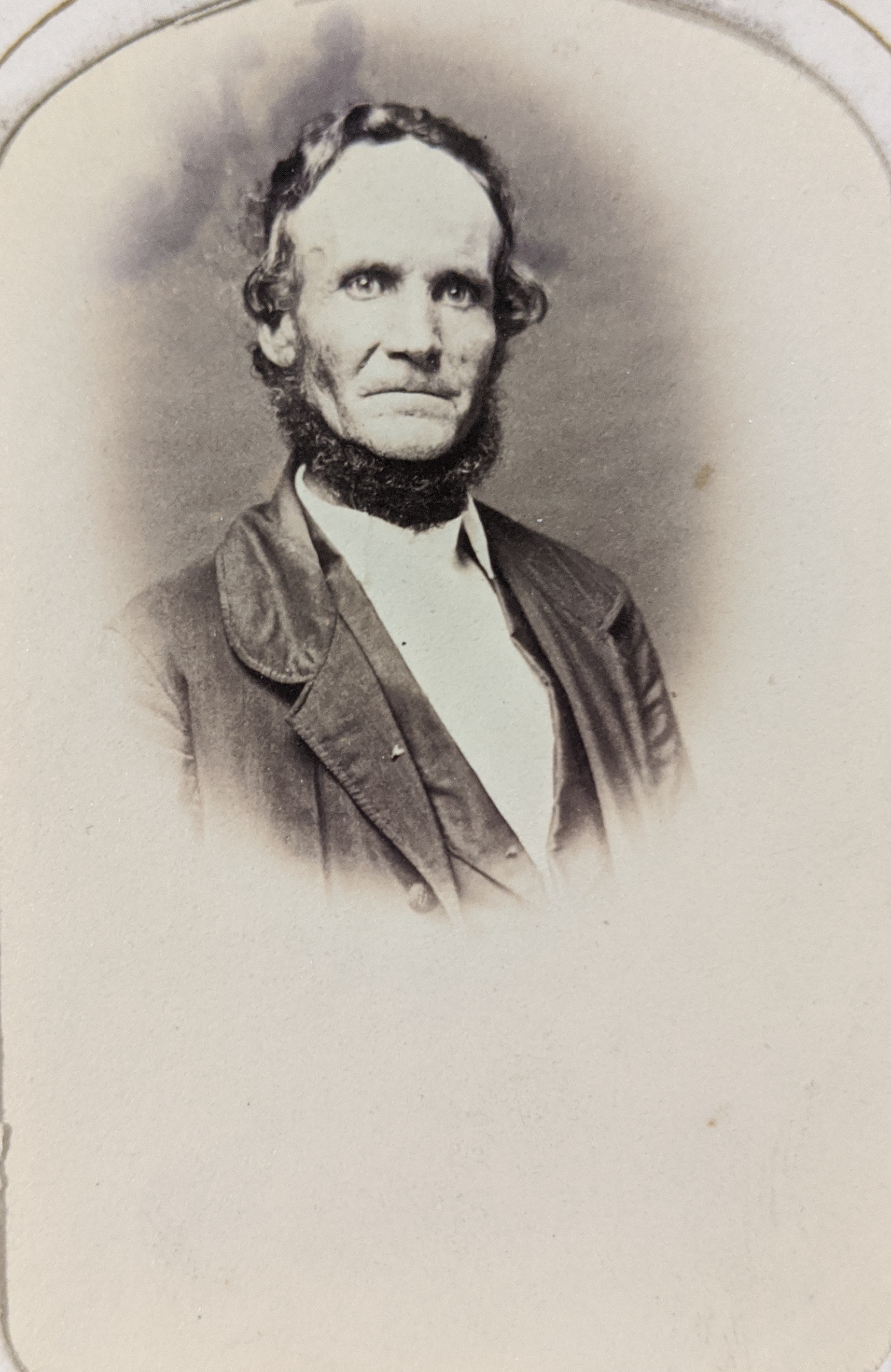 This photograph of James Pinney (b. 1807, d. 1877) is located in the Pinney Family Bible. James Pinney was born to Azariah and Dorcas Cornish Pinney who came to Worthington in 1804. James is the grandson of Captian Abner Pinney, member of the Scioto Company that founded Worthington. He married Esther Minerva Walker in 1837 and the couple had six children; Marietta, Weltha, Henry, James Franklin, Eleanor and Charles. They lived on a farm on the west side of the Olentangy just south of Worthington. In 1873 Pinney served as a trustee for Walnut Grove Cemetery and on the Worthington Village Council in 1875 and 1876. He is buried at Walnut Grove Cemetery.