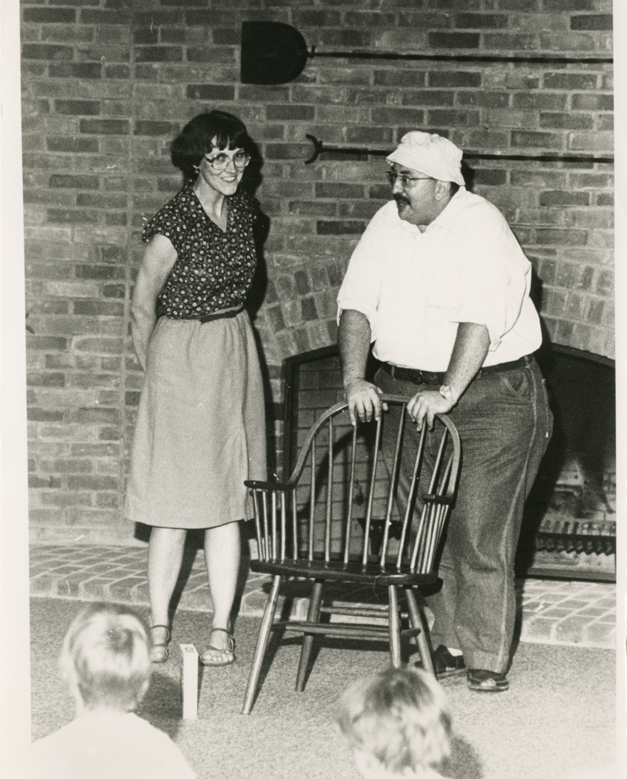 This black-and-white photograph shows librarian Jo Osborne and author Daniel Pinkwater in the fireplace area at the Old Worthington Library during a public presentation he gave on August 4, 1982.