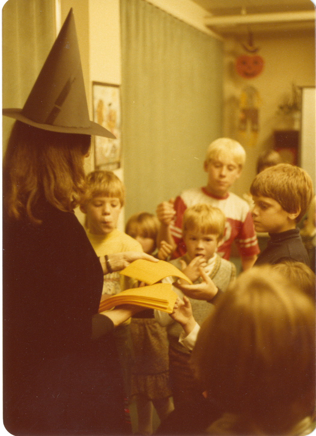 Pictured here is children's librarian Rachel Alexander, dressed as a witch for Halloween, at the Worthington Public Library. In the picture she is handing out sheets of felt to kids for her program .