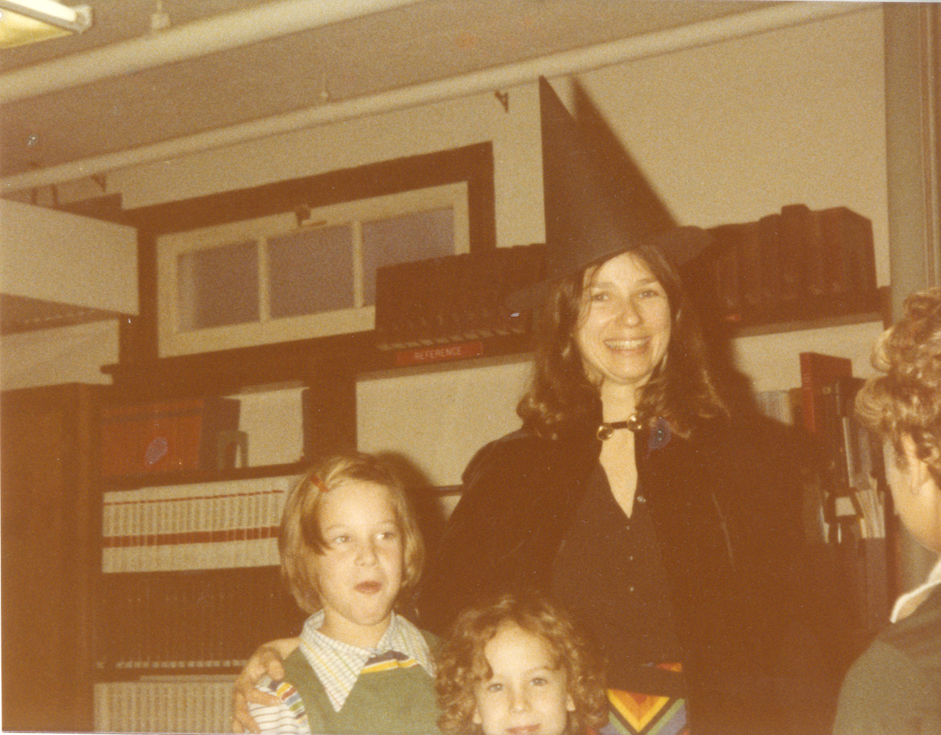 Pictured here is children's librarian Rachel Alexander, dressed as a witch for Halloween, at the Worthington Public Library, 752 High Street. Also in the picture are two children facing the camera, as well as a third in the foreground, facing away from the camera.