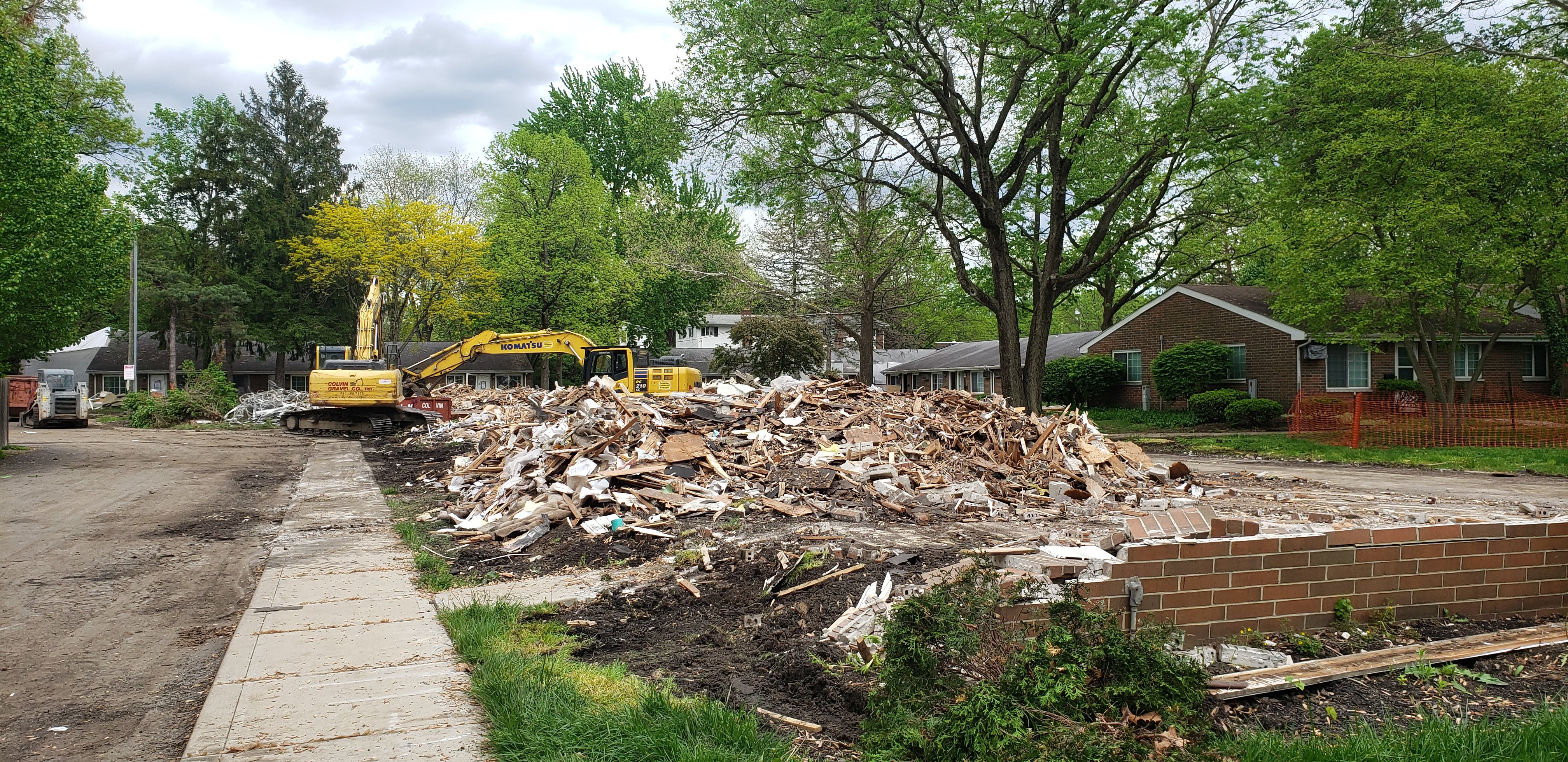 Pictured here is one of the buildings in the Stafford Village Retirement Community that has been demolished. In the background is a backhoe and other construction equipment.