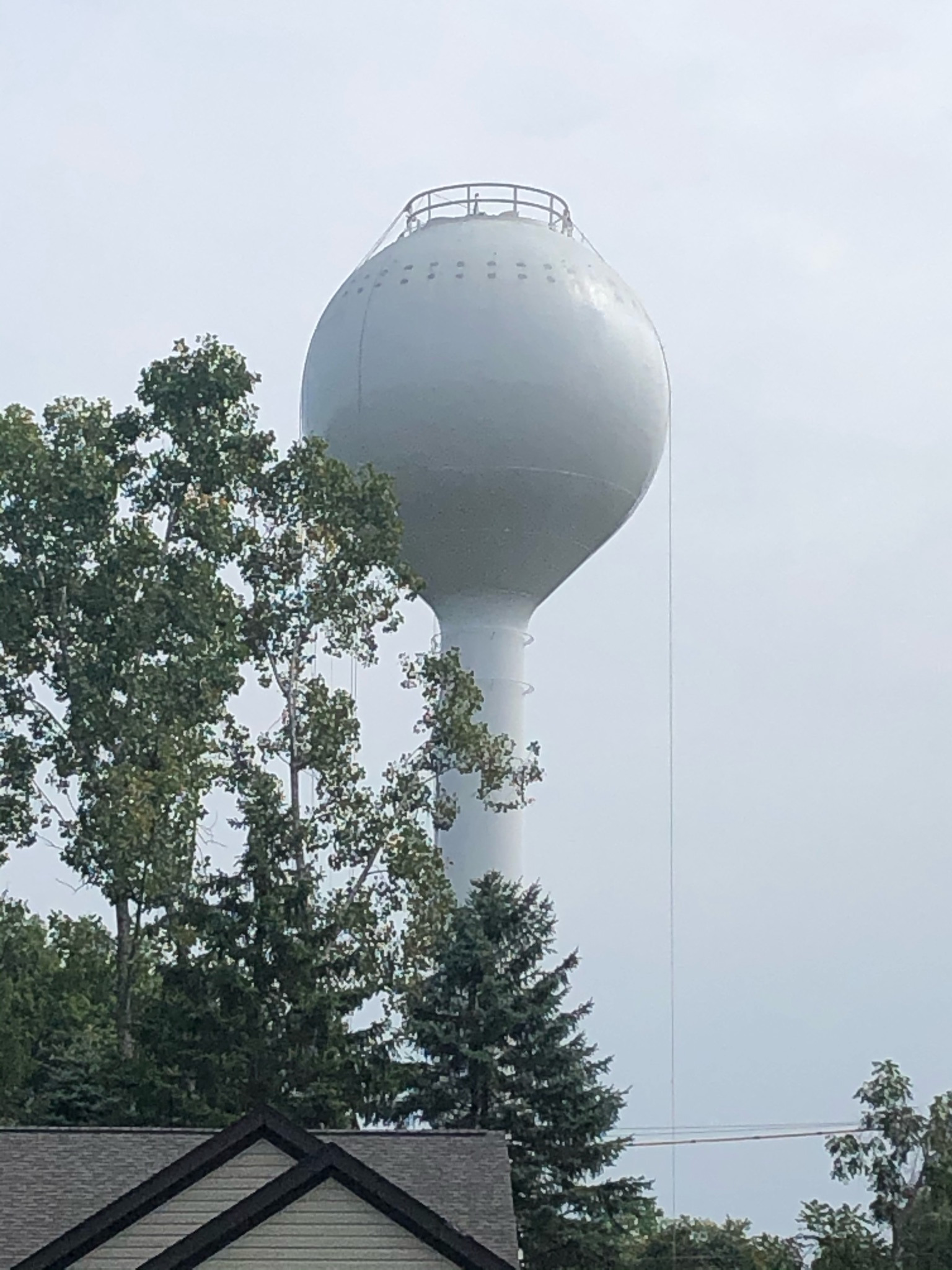 This photograph shows the water tower on the Worthington Hills Country Club property as it appeared on September 24, 2020 as its repainting is being wrapped up. The tower is freshly painted white. A tarp that had been staged around the top of the tower since late August has been removed. The tarp had been lowered completely over the tower to contain dust during the sandblasting process before it was covered in primer and fresh paint. Click on the map in the lower right corner of this page to view other scrapbook entries showing the photographic progress of its repainting.