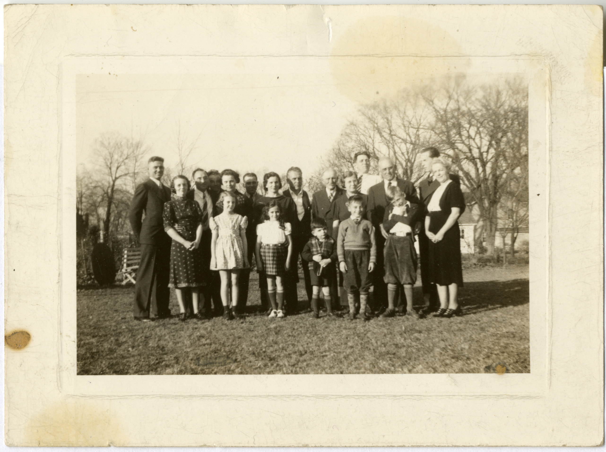 This photo shows the Snouffer family in 1943. Back row: Leslie R. Snouffer (b. 1901, d. 1986), William (Bill) M. Snouffer (b. 1897, d. 1990), Edith M. Snouffer (b. 1898, d. 1987), Mary L. Boyd Snouffer (b. 1907, d. 1995), Raymond (Ray) C. Snouffer (b. 1905, d. 2001), Emma F. Snouffer (b. 1900, d. 1990), Stephen (Steve) M. Snouffer (b. 1899, d. 1992), Unknown, Helen W. Snouffer (b. 1903, d. 1992), Elmer S. Snouffer (b. 1898, d. 1994), Stanley W. Snouffer (b. 1877, d. 1970), and Paul Snouffer (b. 1921, d. 2014); Front row: Bernice E. Snouffer (b. 1905, d. 2001), Phyllis A. Snouffer Hollenbaugh (b. 1928, d. 2017), Donna Lee Snouffer Chamberlin (b. 1931), Harlan K. Snouffer (b. 1934), Richard (Dick) K. Snouffer (b. 1930, d. 2008), Edward (Ed) S. Snouffer (b. 1929, d. 2005) and Myrtle (Myrt) Near Snouffer (b. 1886, d. 1969).