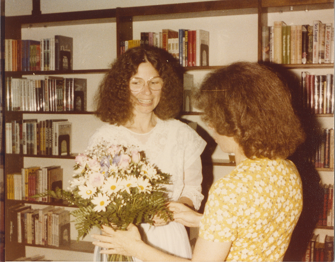 This color photograph shows (left to right) librarian Rachel Alexander and Barbara Groseclose at the Old Worthington Library for Alexander's wedding, which took place in the library that evening, May 8, 1982. The two are shown holding and looking at a bouquet, with Groseclose facing away from the camera. They are standing in front of a wall of bookshelves.