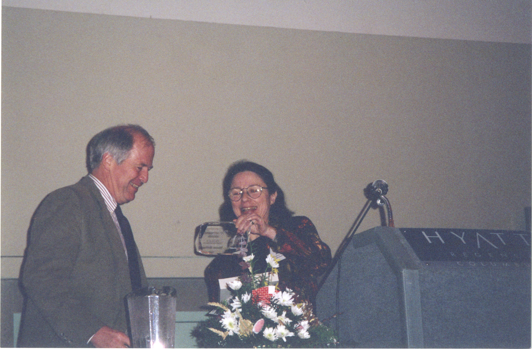 Pictured here is librarian Rachel Alexander (right) presenting author and illustrator Steven Kellogg (left) with the Jo Osborne Award for Humor in Children's Literature. Kellogg was the 1998 recipient of the award, and they are pictured at the award ceremony, which was held as part of The Ohio State University Children's Literature Conference.