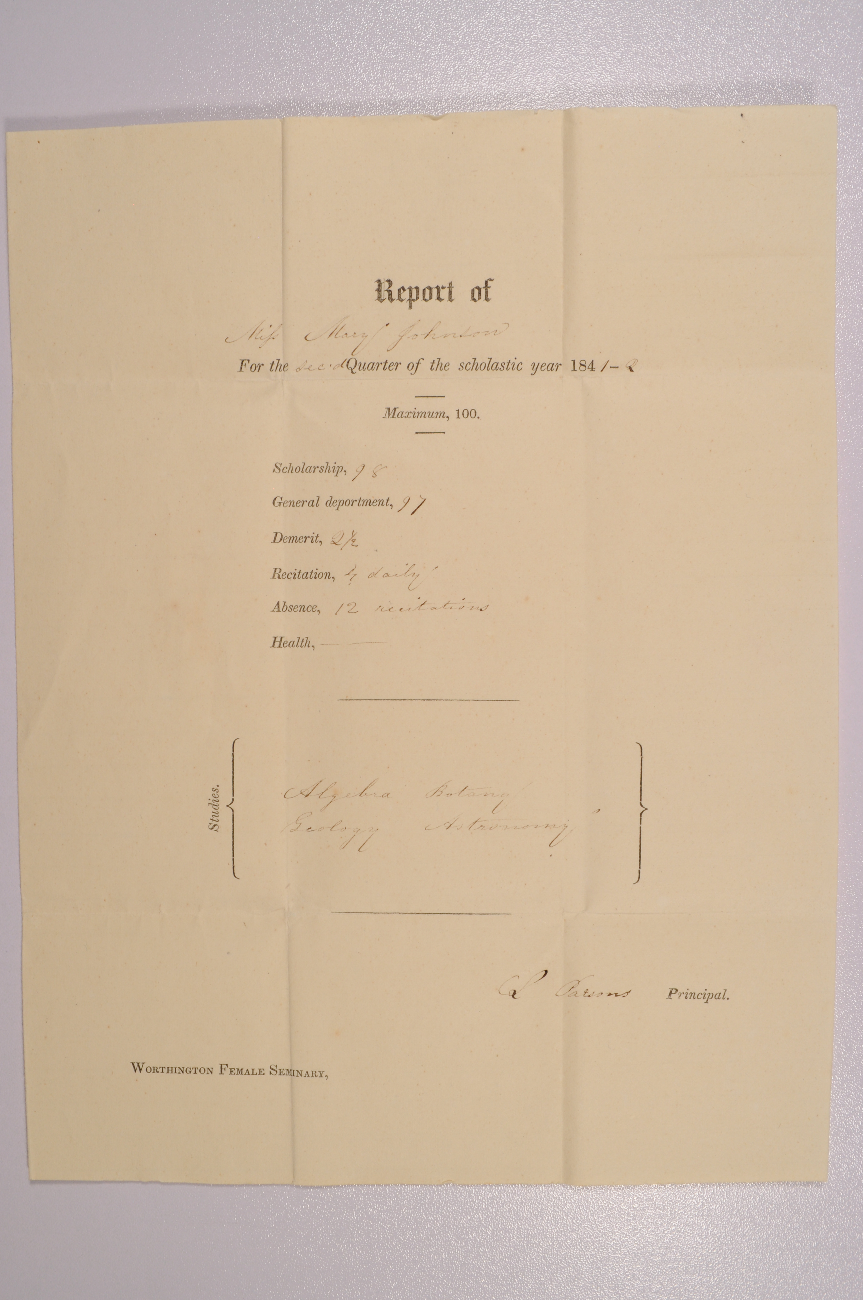 This report card details Mary Johnson's classes and grades during second quarter of the 1841-42 school year at the Worthington Female Seminary. It was sent to her father, Orange Johnson, by C.L. Parsons, principal of the school. The subjects she studied during the quarter were Algebra, Botany, Geology, and Astronomy.