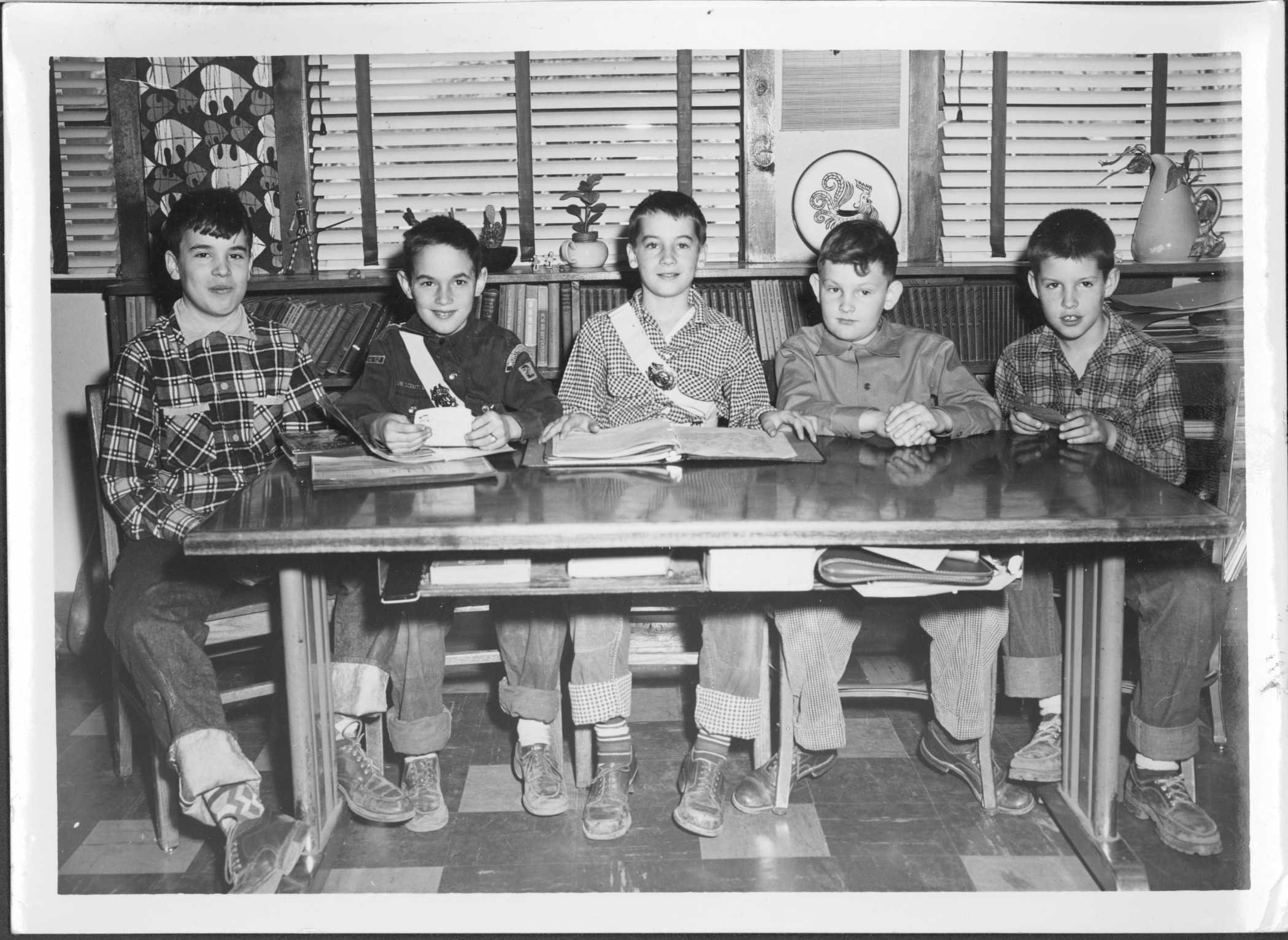 Five school boys are pictured here. Two are wearing safety patrol badges. The boy second from the left wears a cub scout uniform. Cub scouting began in the United States in 1929.