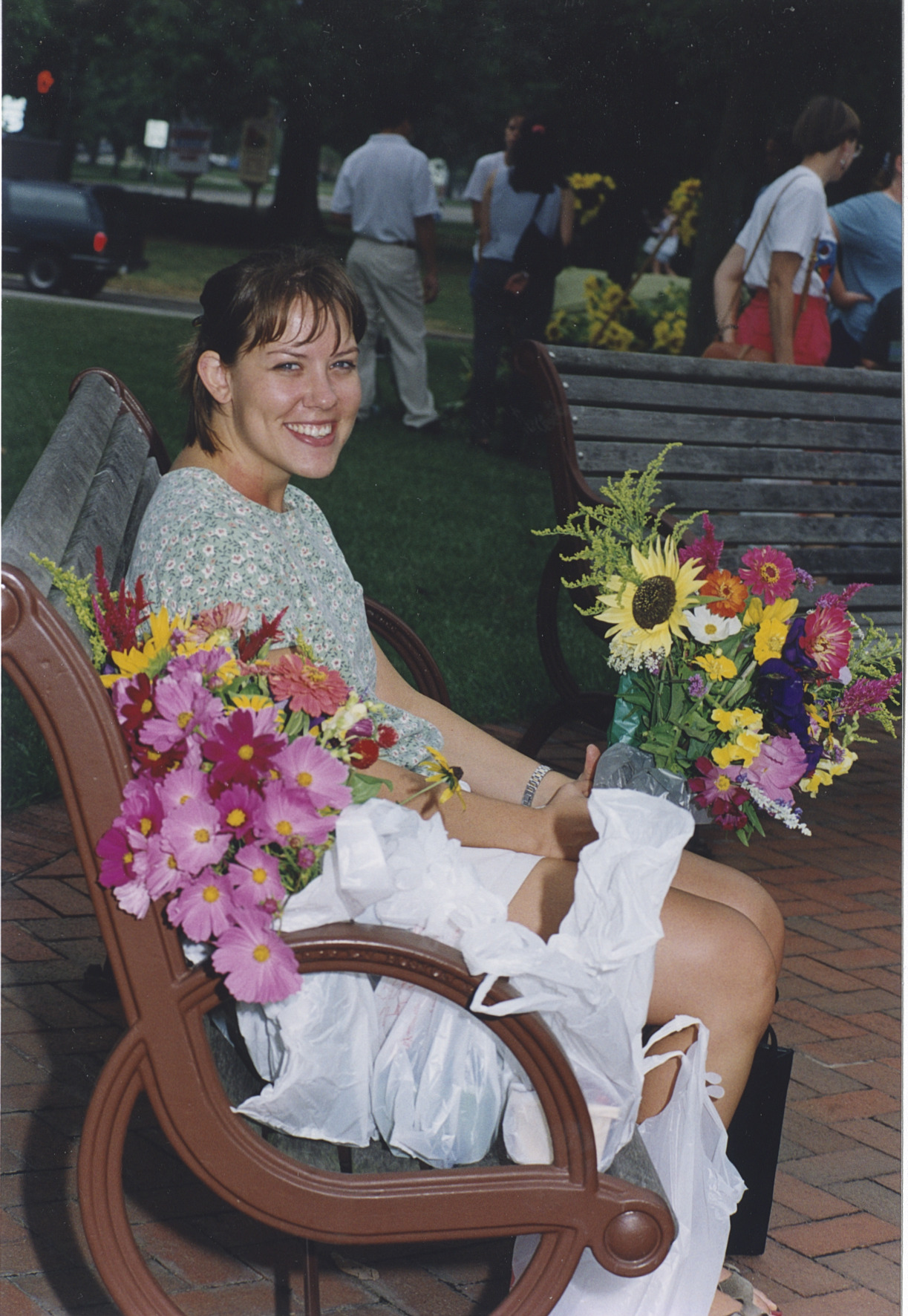 Pictured in this color photograph is a person sitting on a Village Green bench at the Worthington Farmer's Market, holding a bouquet of flowers and smiling at the photographer. Next to her is a second bouquet, as well as several plastic bags, suggesting she is a shopper at the market.
