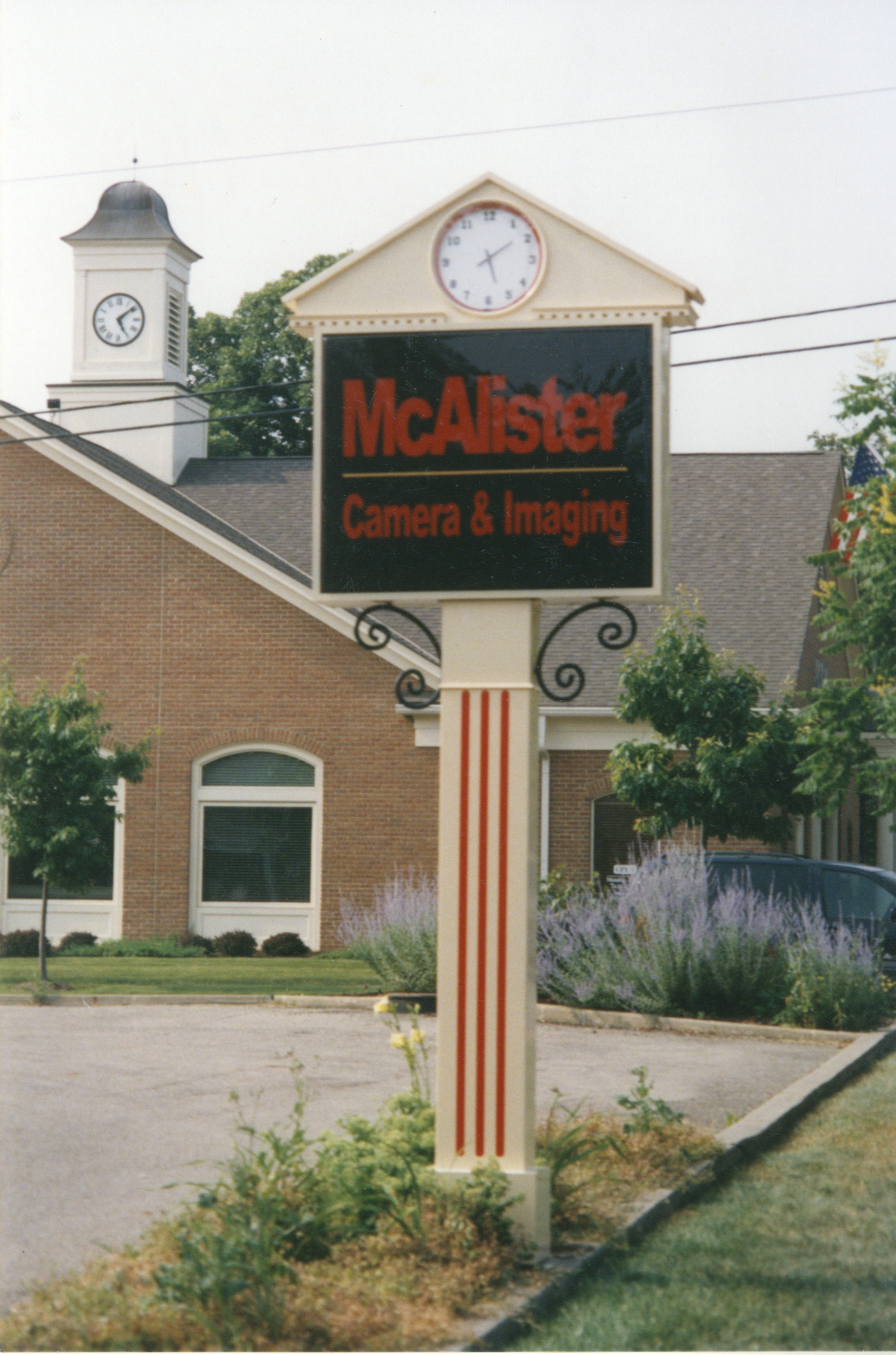 These photographs show the sign for McAlister Camera & Imaging, which was located at 529 High Street. The sign was designed by artist and signmaker William (bc) (Bill) Collins. The sign features the words "McAlister Camera & Imaging" in red on a black background, along with a clock built into the top of the sign.