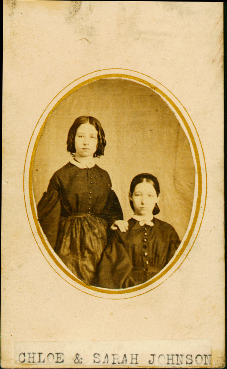 Two sisters, Chloe Johnson (b. 1851) and Sarah Johnson (b. 1849) are depicted here. They were the two oldest children of Reverend Silas Johnson and Harriet Johnson. Silas served as the minister for Worthington Presbyterian Church from 1857-1861. The family eventually relocated to Iowa.