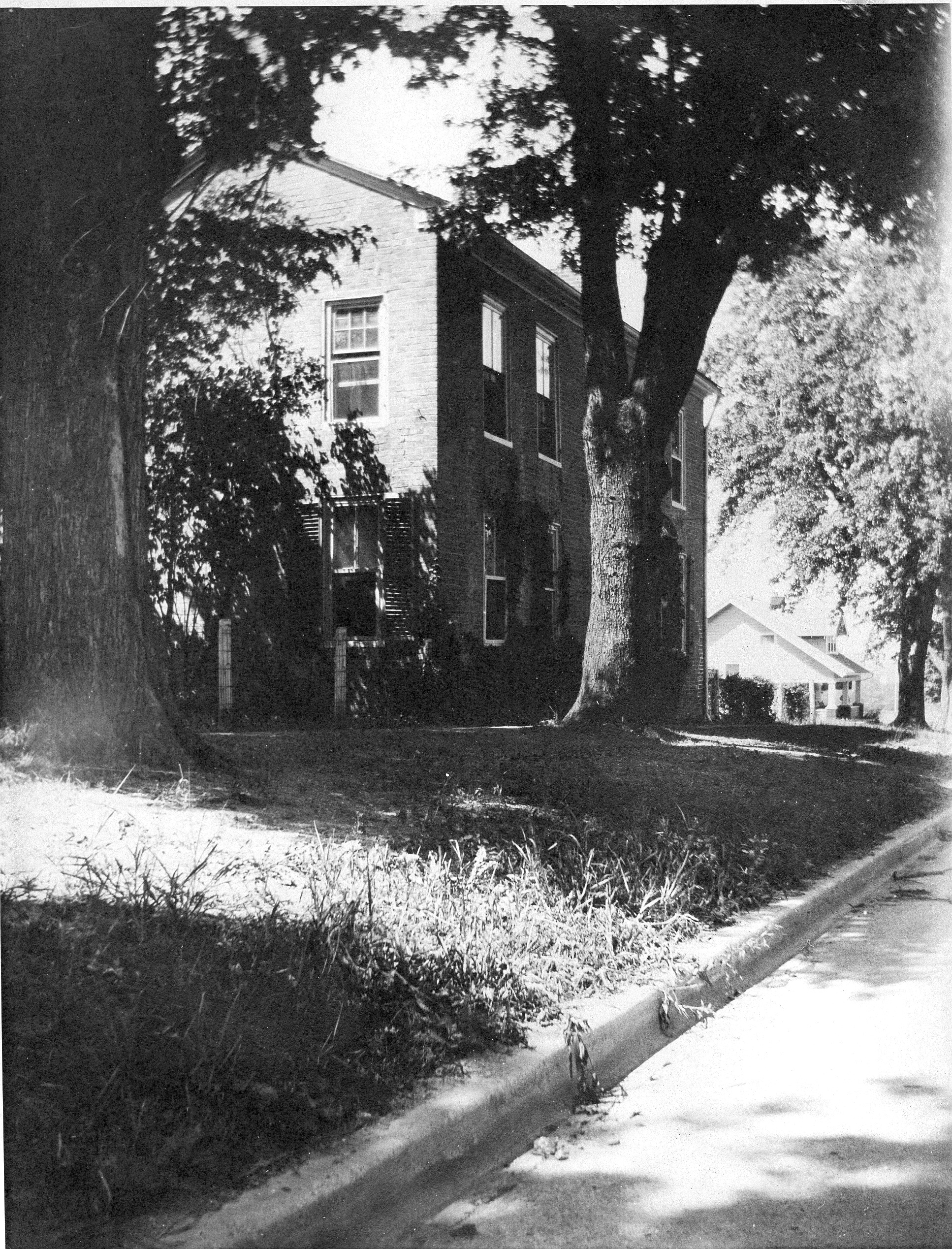 This photograph shows a view from the northeast corner of the John Snow House, located at 41 West New England Avenue. It was built ca. 1815 and is a typical Federal style brick. John Snow, the house's best known owner, emigrated to Worthington in 1817, to become part of James Kilbourn's Manufacturing comapny. He was trained as a jeweler, but is mainly known for his Masonic activity. It is probable that early Masonic meetings were held in this home until the Lodge was completed.
