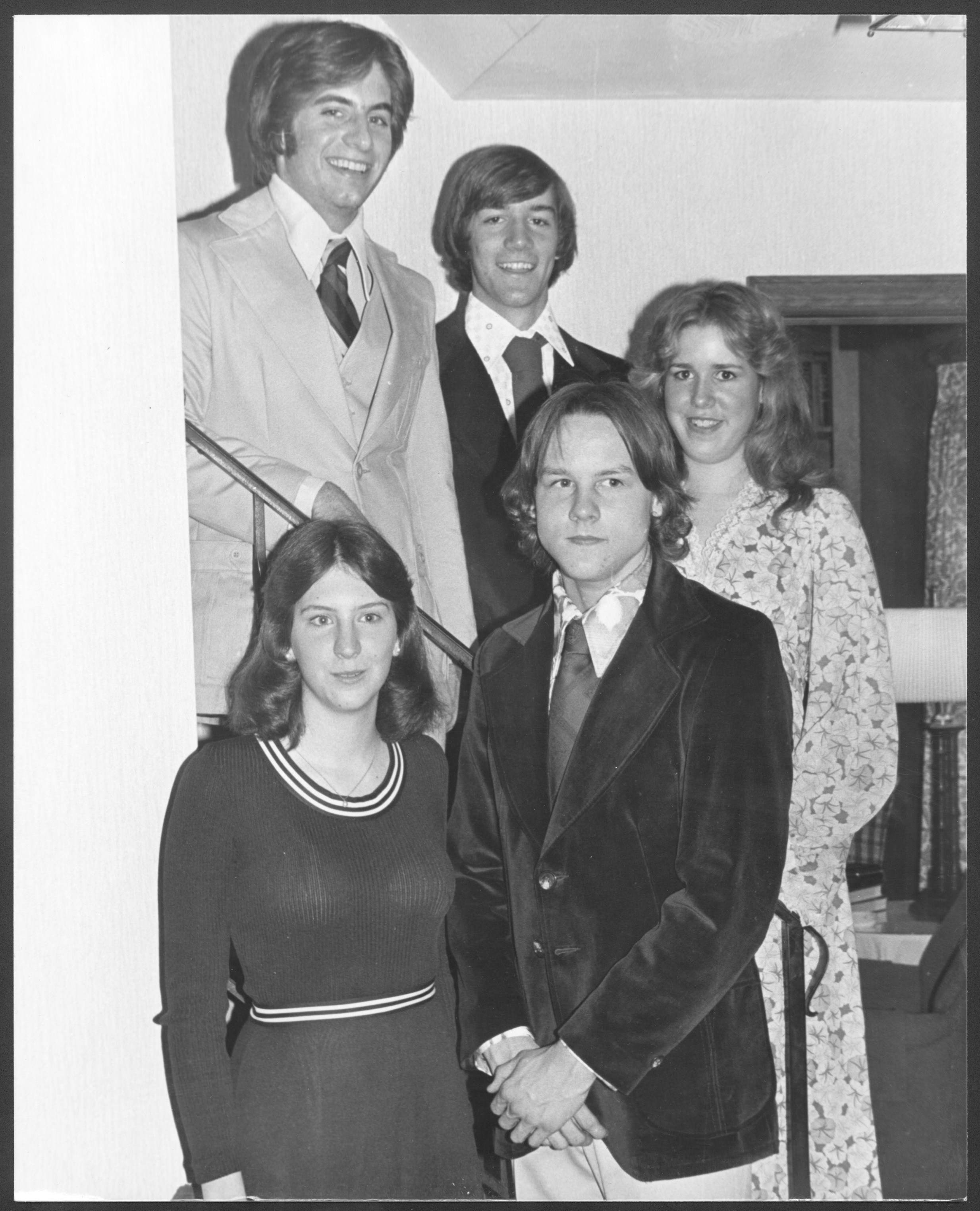 Worthington High School students are pictured modeling formal and casual wear which would be featured at the "Spring Fling" which was held on April 8, 1976. Students pictured are (top row l to r) Bruce Burkman, Jeff Knight, Tori Jones, (bottom row l to r) Margie Maddox, and Jim Long. The Spring Fling, sponsored by the Activity Club featured a fashion show, dance demonstration, stage band, and vocal performances. It was held prior to the school's prom.