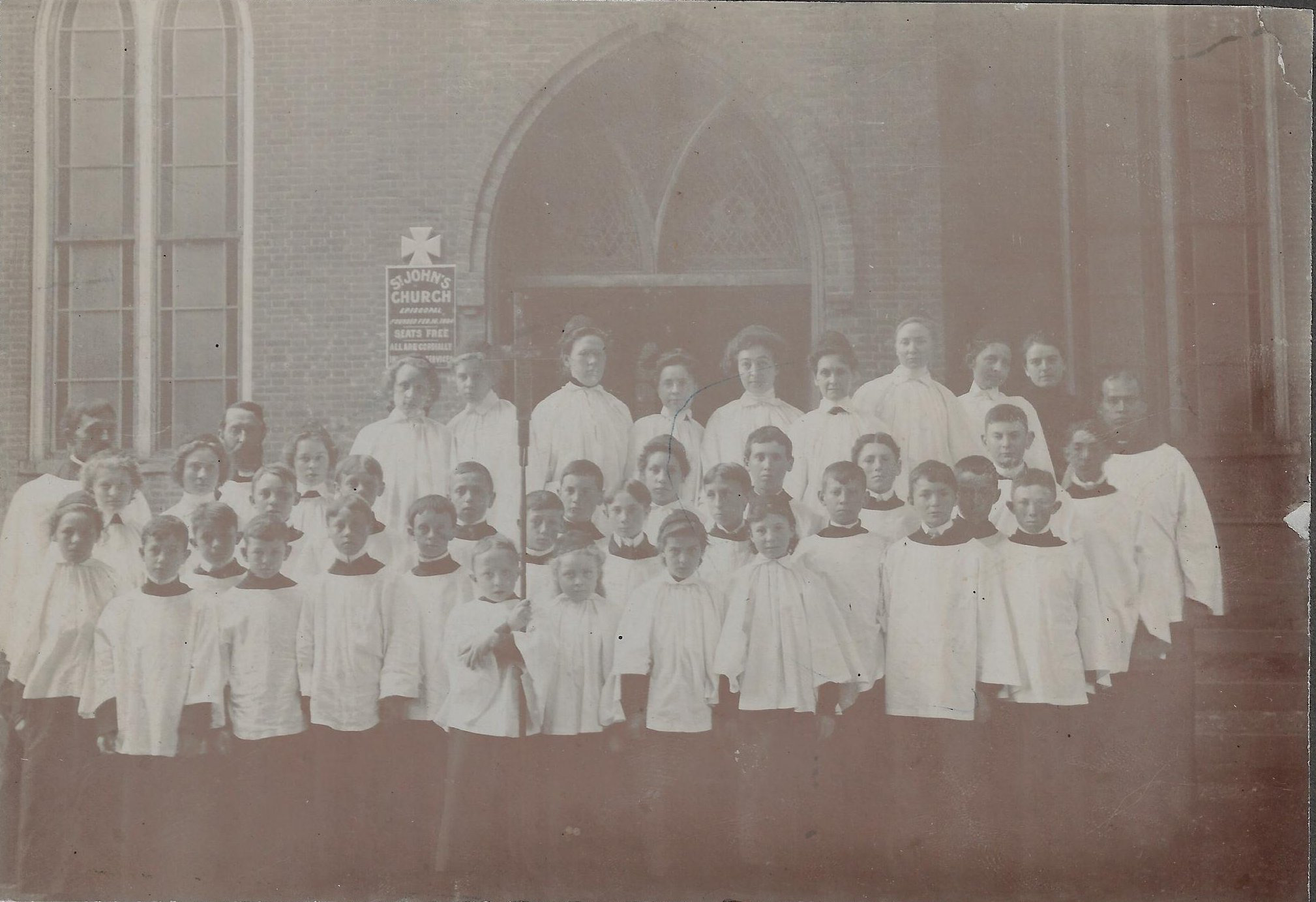 This photograph captures the choir in front of St. John's Epsicopal Church around 1900. The back of the photograph identifies many of the people in the pictures as follows: