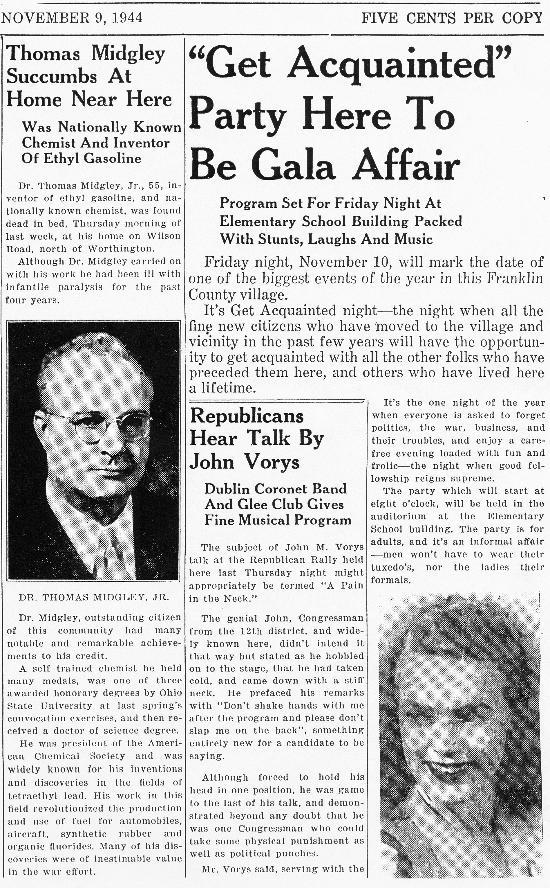 Midgley was Chief of Fuels for General Motors Research Corporation in 1923, Vice President of Ethyl Corporation in 1923, Vice President of Kinetics Chemical, Inc. in 1930, and Director of the Ethyl-Dow Chemical Co. in 1933. He held many medals, was President of the 0.S.U. Research Foundation, and a member of the National Academy of Sciences. In 1940, after contracting poliomyelitis, he continued his innovations at home, and tragically died in 1944 by accidental strangulation in a harness he designed to move himself from bed. This article concerning his passing appeared in the Worthington News on November 9, 1944.