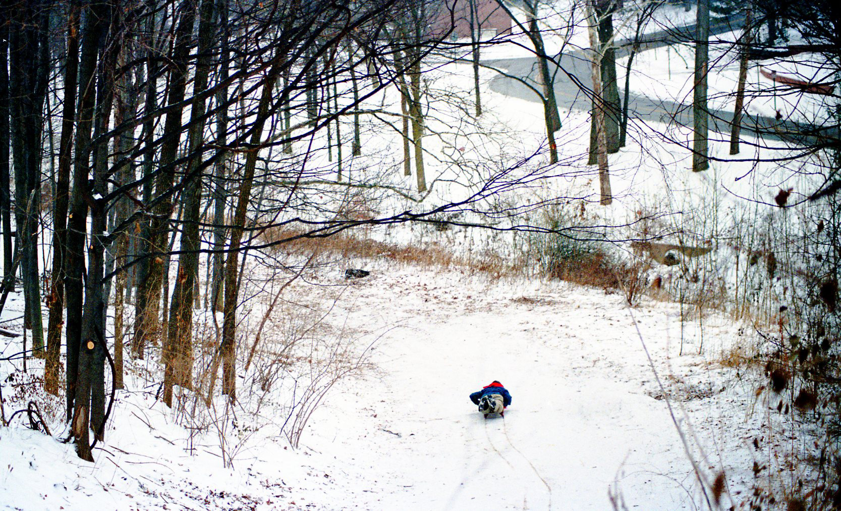 This color photograph shows A. V. Shirk sledding down a sled run in the Colonial Hills neighborhood, known as "Devil's Hill," in December, 1989. He is shown sledding away from the camera, at some distance from it.
