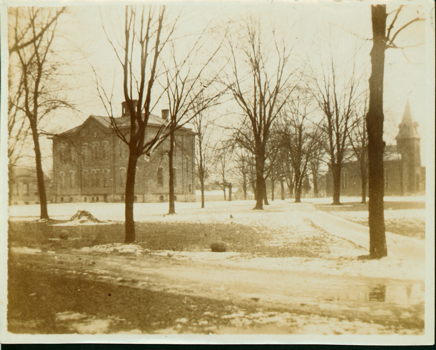 This photograph depicts the east side of the Village Green during the winter of 1910. Worthington School, built in 1874 to replace the 1808 and 1819 buildings, is in the foreground on the left. When the 1874 building was opened, the elementary students were on the first floor and the high school students were on the second floor. Continued growth in the district led to the construction of a high school in 1893, just visible in the background. On the right is St. John's Episcopal Church, built 1829-1830, with the ungainly spire that was later replaced.