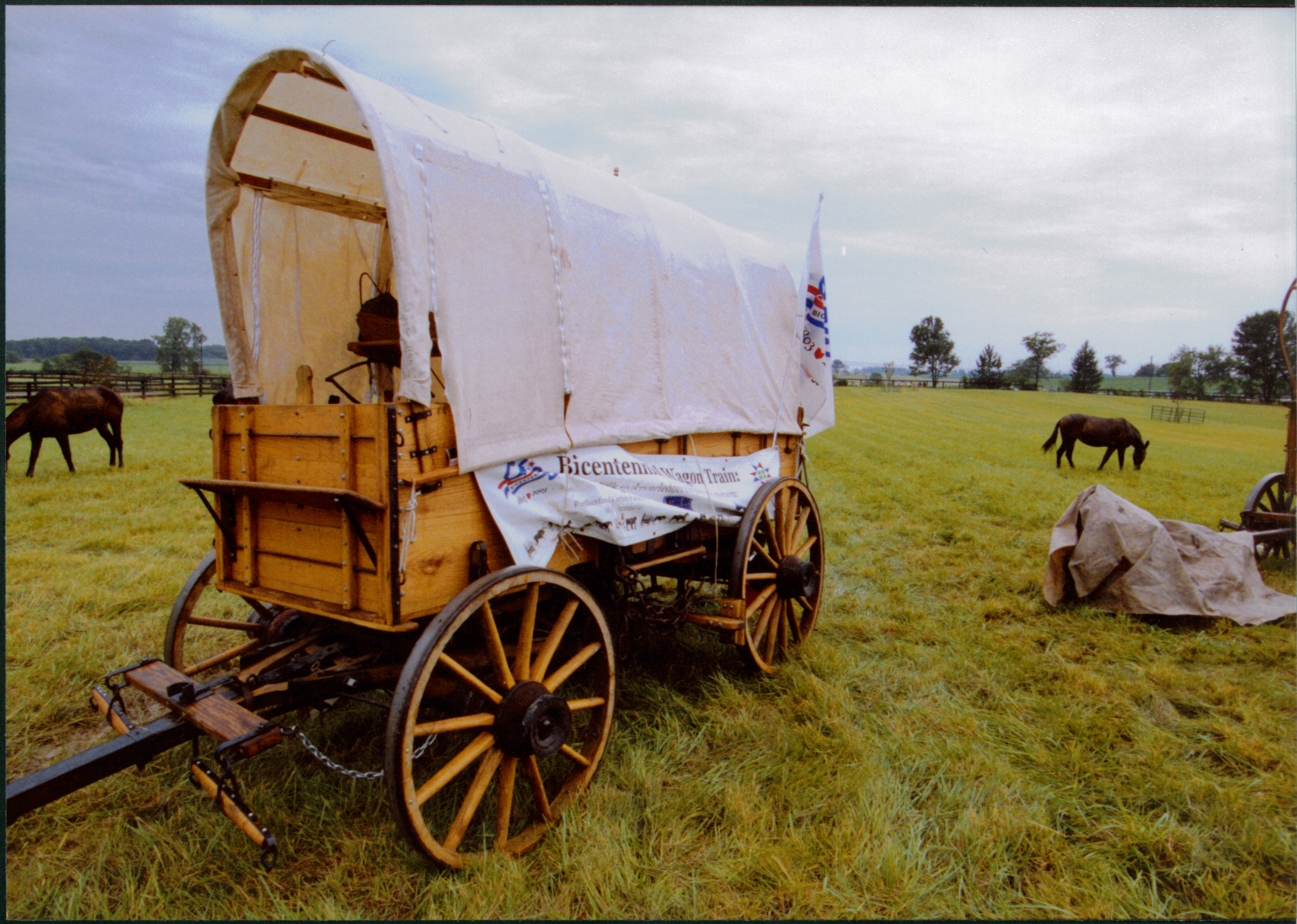One of thirteen wagons provided by the Ohio Bicentennial Commission and the Worthington Bicentennial Committee is pictured at the Trinidad Ranch encampment in Clark County. The canvas covered wooden wagons featured wood steel-rimmed wheels. Wagons were equipped with wooden benches or bales of hay for seating.