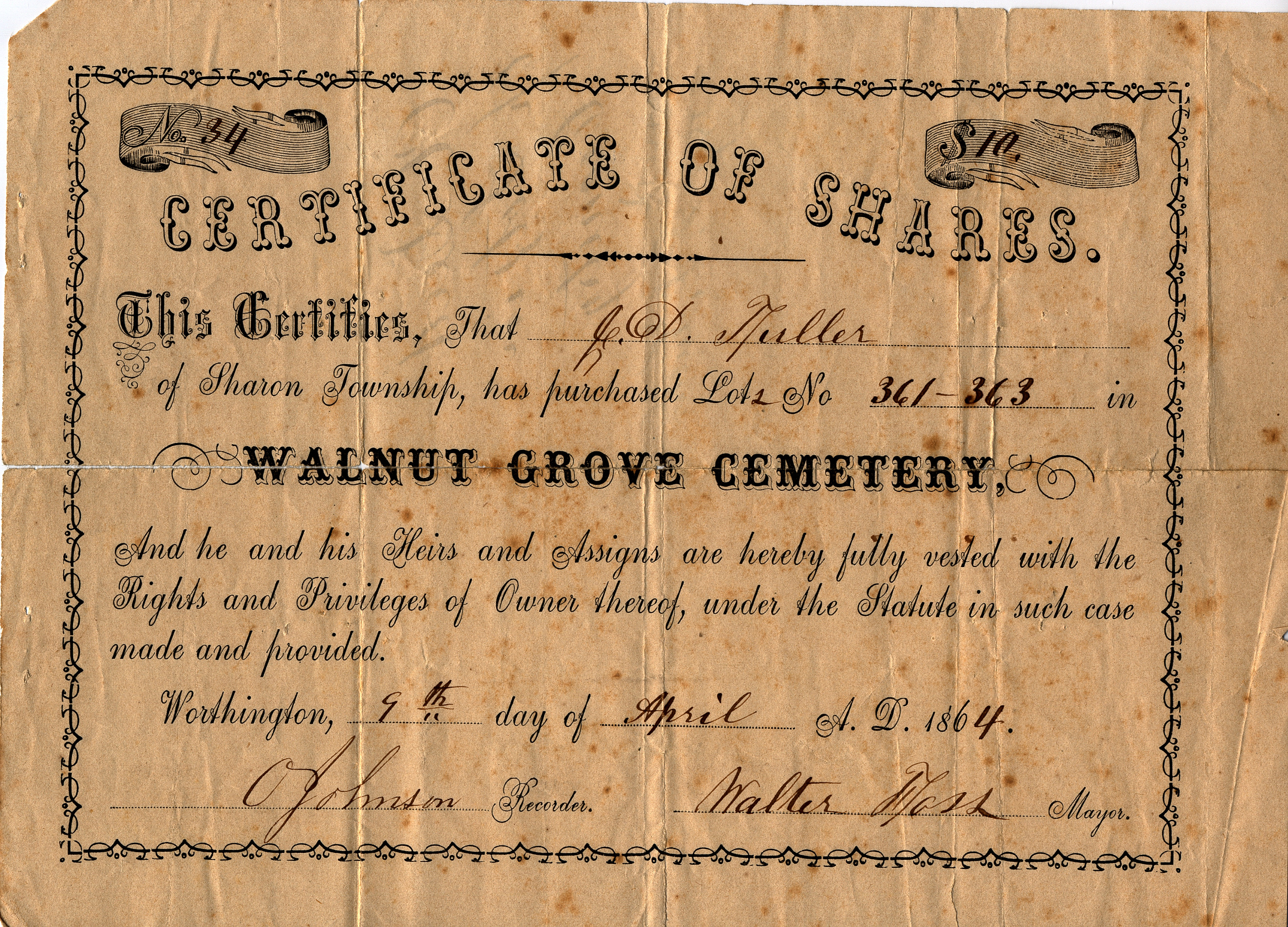 This deed of purchase for lot numbers 361, 362 and 363 in Walnut Grove Cemetery assigns ownership to Jonathan D. Tuller (b. 1807). In 1859 the Worthington Village Council purchased 10 acres of land south of town between High Street and Olentangy River Road for Walnut Grove Cemetery. Four family members of Jonathan Tuller are buried in these plots; wife Almira Tuller, son Clinton Tuller, daughter ElizaTuller and Albion Tuller (son of Adolphus and Martha Tuller.) The deed was signed by Orange Johnson, Recorder and Walter Foss, the Mayor of the Village.