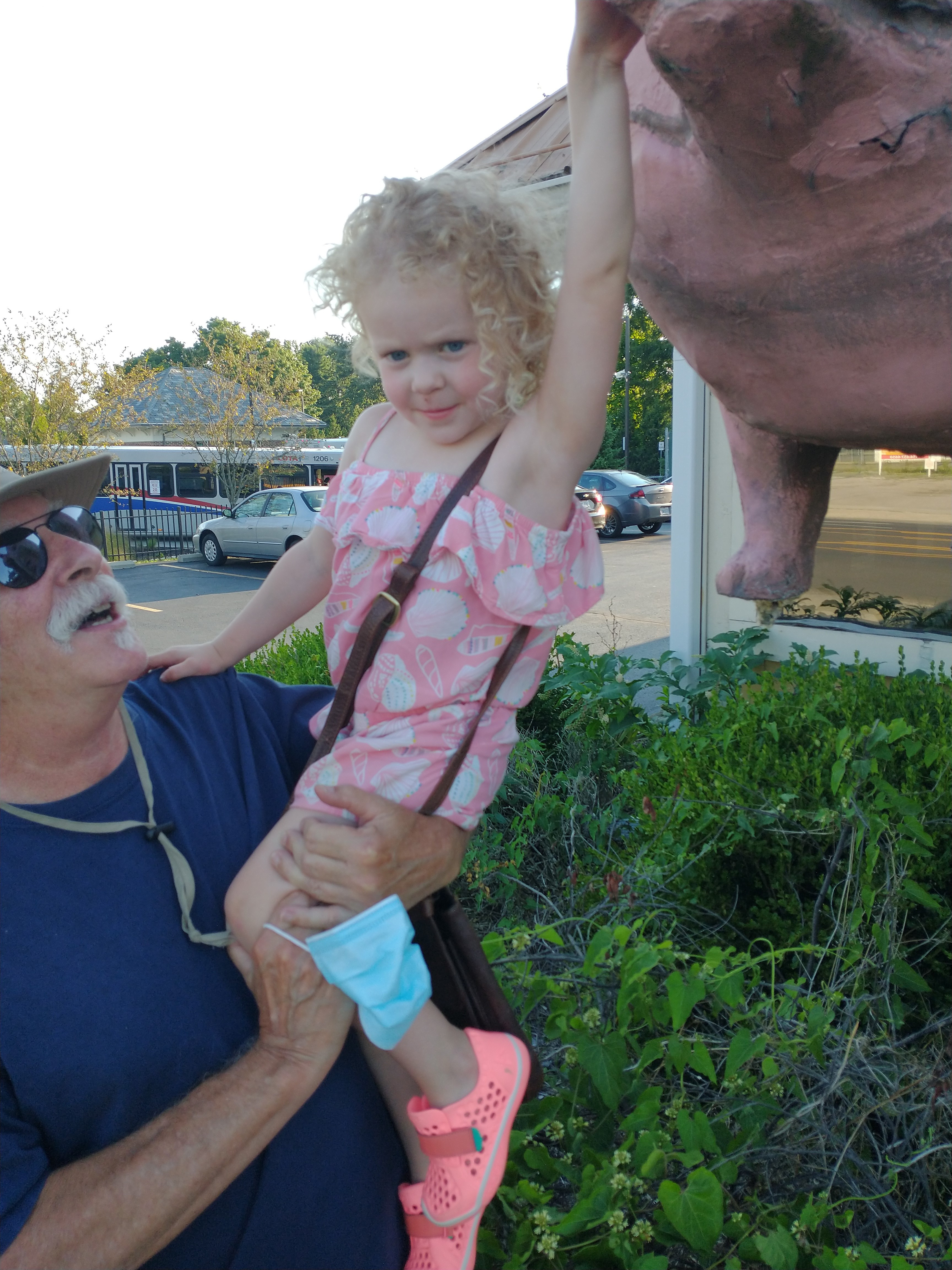 William (bc) (Bill) Collins with Granddaughter at the Iron Grill Pig Statue