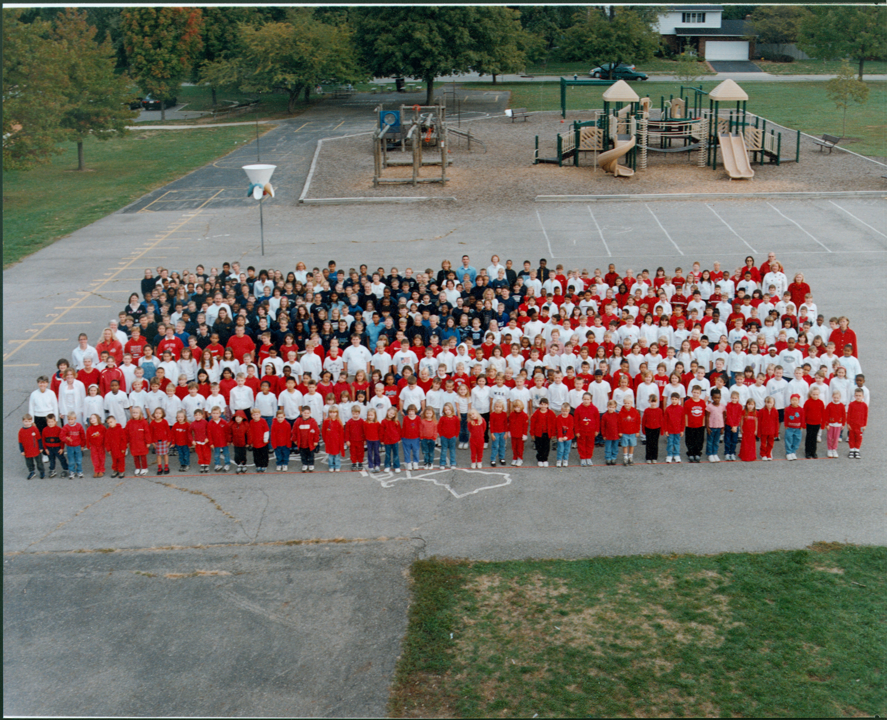 The entire student body and the staff of Worthington Estates School formed the United States flag to recall that Ohio was the 17th state to enter the union in 1803. This photograph taken on the school grounds during the fall of 2002 as the City of Worthington's Bicentennial Celebration began.