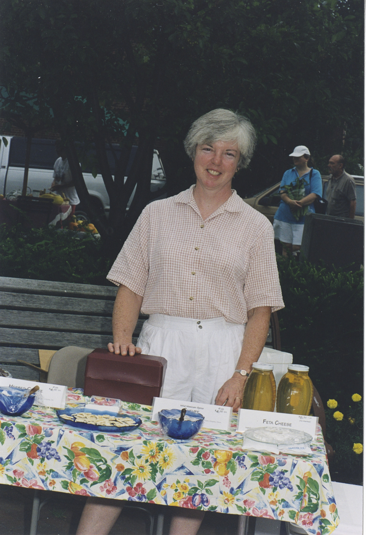 This color photograph shows a vendor selling cheese and pickles at the Worthington Farmer's Market. She stands smiling at the camera behind a table with jars of pickles and dishes of cheese for sampling. Three shoppers can be seen behind her browsing other vendors, as well as cars parked in the background. A date stamped on the back of the photo indicates it was developed in August, 1998.