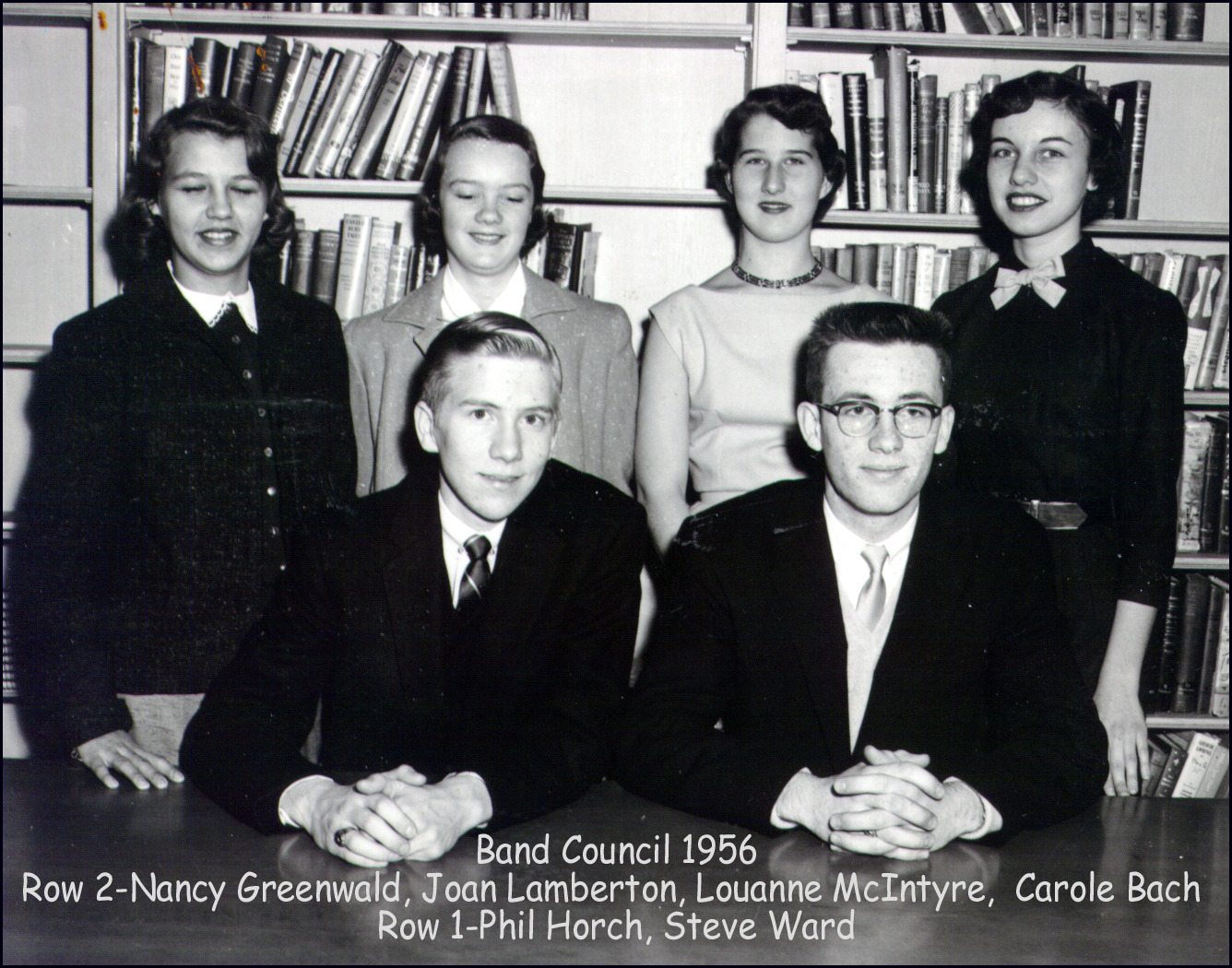 The role of the Band Council was to work with Student Council Pep Rally Committees to plan programs requiring instrumental music. Members are identified as (back l-r) Nancy Greenwald, Joan Lamburton, Louanne McIntyre, Carole Bach, (front l-r) Phil Horch, and Steve Ward.