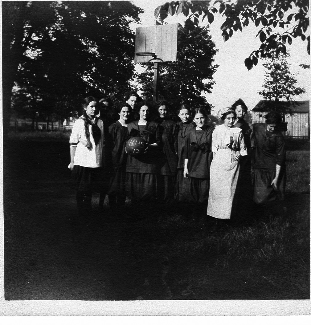 Worthington High School girls dressed in gym bloomers are pictured in front of a basketball hoop in this photograph. One of the girls holds a basketball labeled WHS '12. Basketball was invented in Massachusetts in 1891 by a Canadian, James Naismith. Initially soccer balls were used to play the game. Larger balls specifically made to play basketball were introduced in 1894. Peach baskets were originally used for hoops, along with backboards such as the one pictured here. Basketball was an extremely popular sport, especially for women. Collegiate women's teams played as early as 1896, and the sport debuted in the 1936 Olympics.