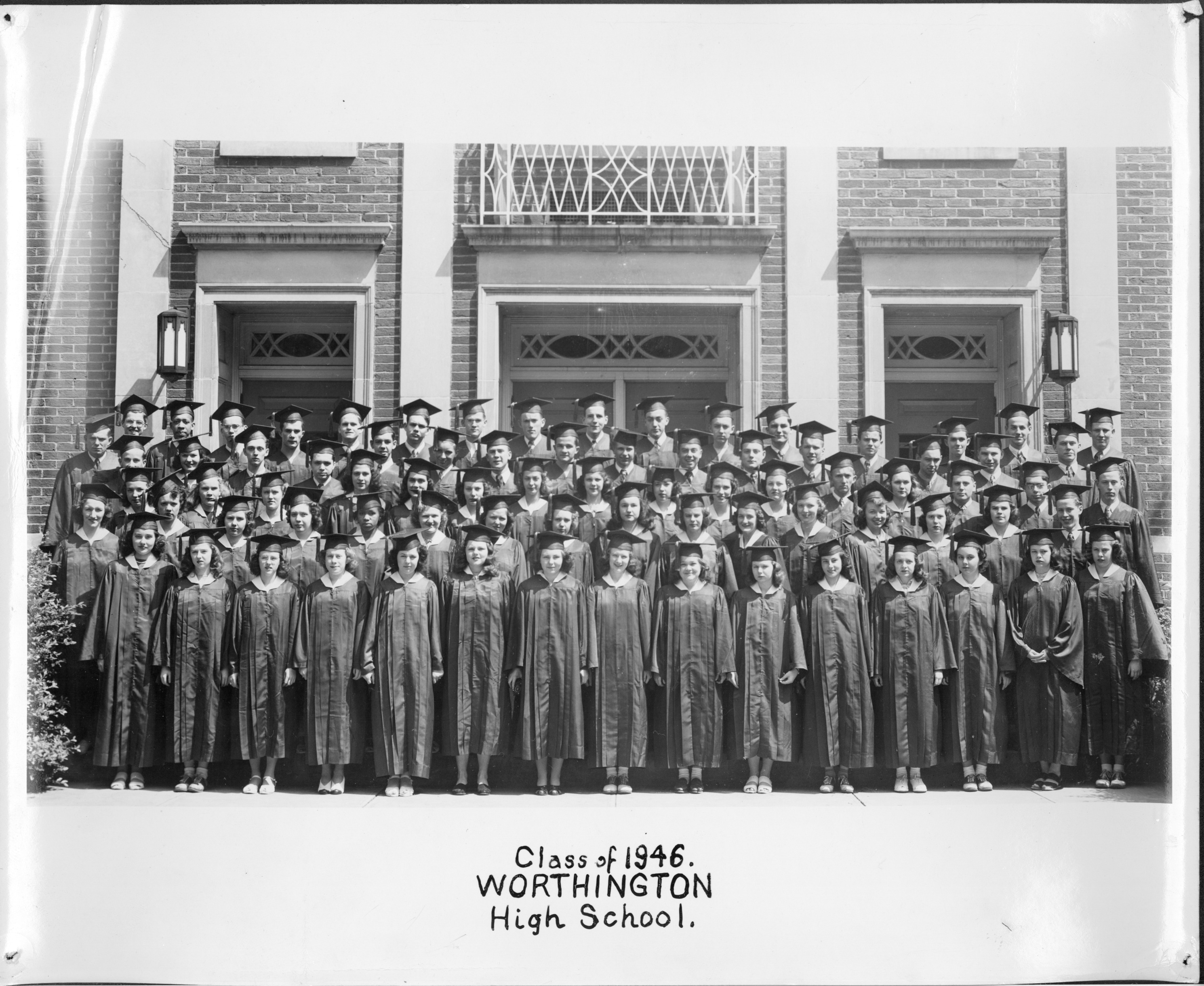 The graduating class of Worthington High School, 1946 included; Joan Bellows, Barbara Bender, Henry Blake, Pat Blakesley, Max E. Bohmont, Elizabeth D. Bolton, Wanita Bowers, Ruthanne Brady, Robert L. Brooks, Phil Brown, Wanda Buck, Barbara Buell, R. E. Burwell, Margie Call, Gary Carle, Ruth Carlton, Bill F. Chadeayne, Marilyn Christian, Carl Emery Clements, Anna B. Davidson, Betty Denig, Jack V. Denkewalter, Dona Diercks, Donna Dildine, Robert M. (Bob) Dominy, Toni East, Wanita Egelhoff, Betty Ellyson, Ann Frass, Louis E. Francis, Elmer J. Gausman, Belford Griffith, Ken Grubb, Clarice Guden, Robert A. Hall, Ardie Hamilton, William A. Hamilton, George T. Harding IV, Sam J. Harsh, Tom E. Hartman, Robert B. Henry, Virginia Hetrick, Jane Hoag, Janet Howard, Robert Wayne Jewett, Dona Johnson, Jane L. Joseph, Ken W. Kayner Jr., Patricia (Pat) Kerr, William O. Lindimore, Ada Llyod, Ila Lyons, Ada Mayall, Lena McPhearson, Phyllis Moench, Jeannie Moore, Joe Morgan, Molly Morgan, Joe R. Neds, Jo Ann Nesser, Barbara Newell, Judy Nocker, Dave Norman, Norma Notestone, David D. O'Brien, Betty Pfefferle, Jack Pruden, Mary Raymond, Glenn C. Reed, Eleanor Rowland, Homer Ruppersburg, Don Russell, Charlene Shuster, Tom K. Snouffer, Martin P. Strickland Jr., Ray Sunderland, Dona Tarbutton, Gwen Turner, Ted Turner, William C. Wardwell, Jack P. Way, Doris Wood, Dean A. Wright, Don E. Wright and Francis M. Ziegler.