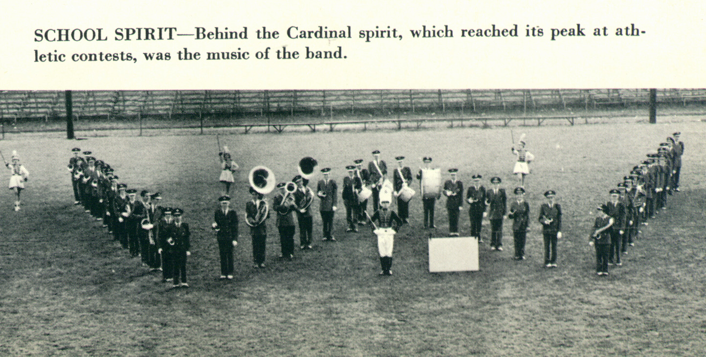 The 1956 Worthington High School Marching Band is pictured in W formation on the school's football field. The Instrumental Department at Worthington High School included a Concert Band, Marching Band, Dance Band, and Orchestra. The Instrumental Music teacher was Russell Hill.
