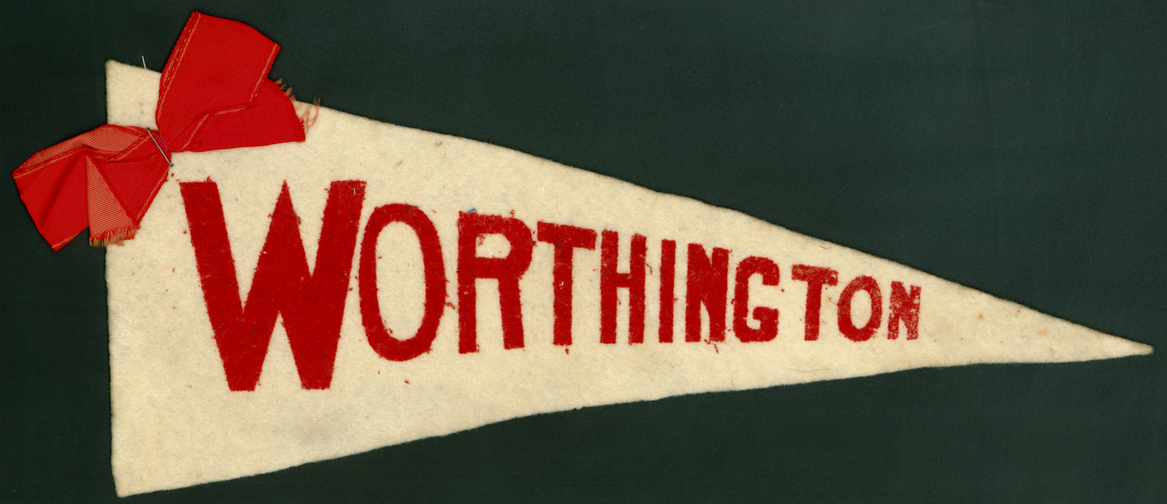 This triangle banner made of white felt with a red satin bow and red lettering measures 11.38 in. x 11.75 in. x 4.75 in. Triangle pennants such as this are frequently used as school banners. This banner was created for Worthington High School in the 1950s.