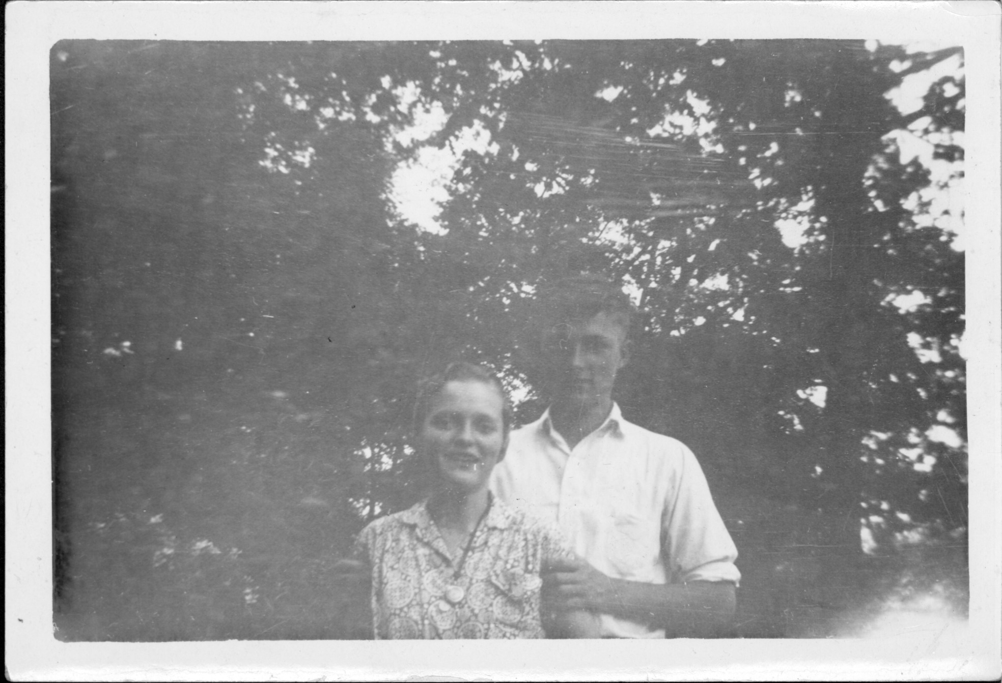 This photograph is from the "Senior Memories" diary of former Worthington High School Student Padi Goerke. The picture was taken with several others on the grounds of the old Worthington High School on Granville Rd., known as the Packard Annex. The following caption accompanied the photograph; "Gwen Paschall and Darrell Wood".