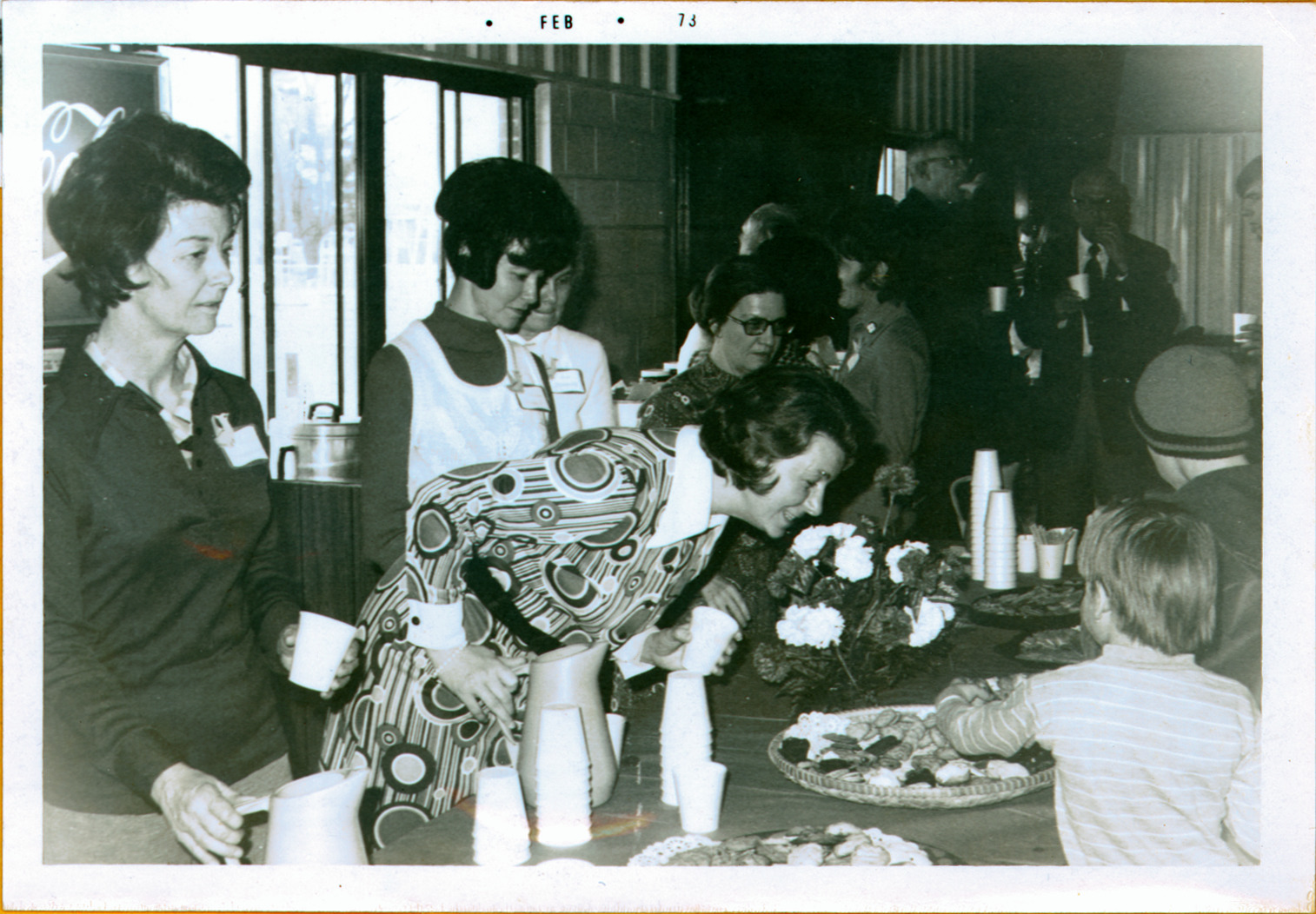 Pictured here are members of the Activity Club at the open house and dedication ceremony of the Worthington Natatorium. The indoor swimming pool, dedicated to the youth of Worthington in memory of David Burt and Charles Shupe opened in February 1973. David Burt and Charles Shupe were members of the Worthington High School swim team who lost their lives in a traffic accident 1966. The open house and dedication ceremony were sponsored by Swiminc, the Cardinal Boosters, and Worthington Swim Boosters. The event featured the Worthington High School swim team, scuba diving demonstrations, and high diving exhibitions. The Activity Club provided refreshments for the event.