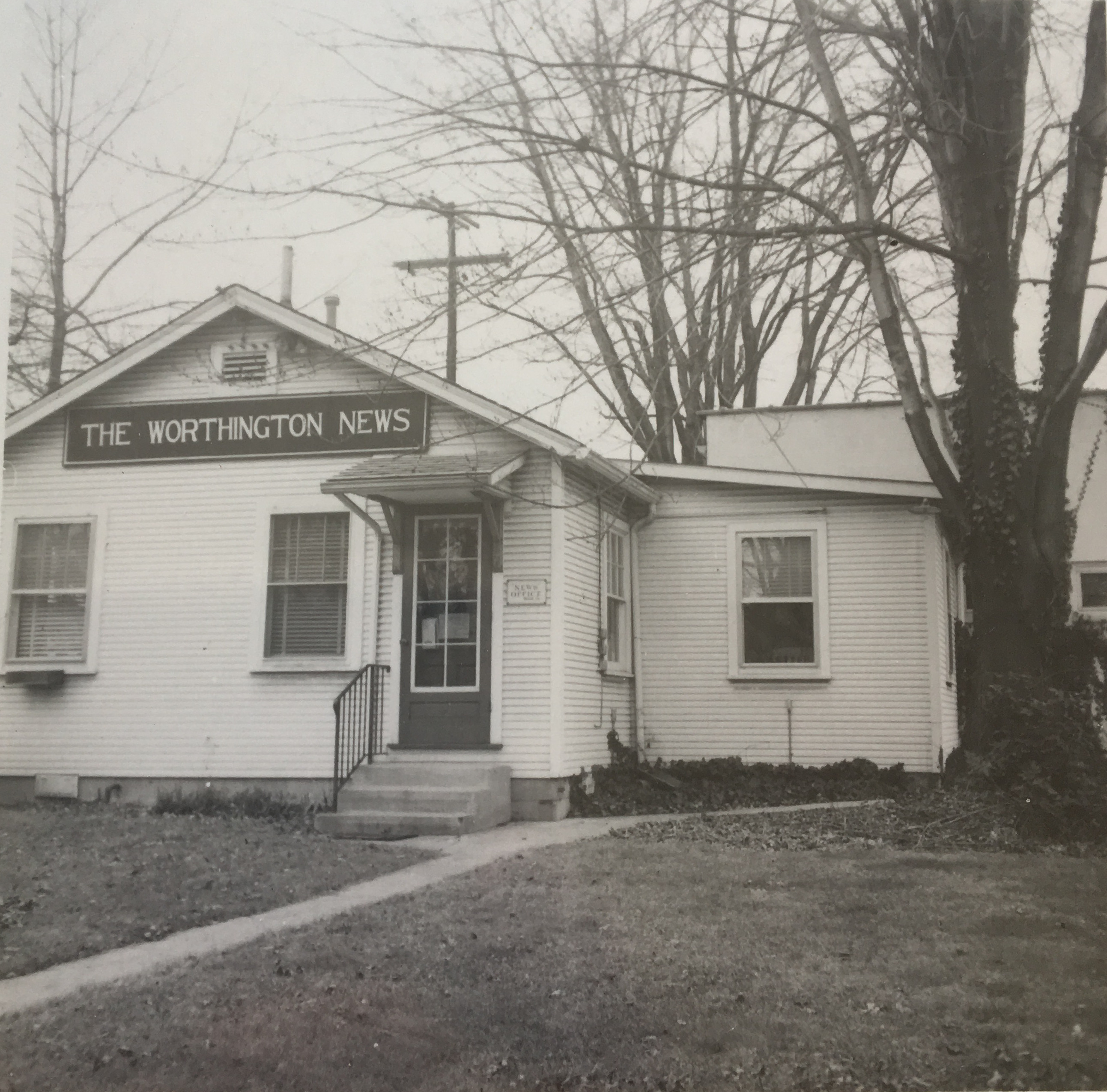 This photograph shows the Worthington News Building around 1966. The first issue of the newspaper was printed March 12th, 1925, and at that time editor Leonard Insley ran the venture from his home at 671 Hartford St. A short time later, a building was erected at the rear of the property for the production of the paper. This image reflects a later expansion that allowed the office to move from the Insley residence to the building. The Worthington News was managed and edited by the Insley family until 1989. The building has again been reconfigured, with the original building still standing in the center. It is now known as 666 High Street and is home to Insley Printing, operated by grandson, Paul Insley.